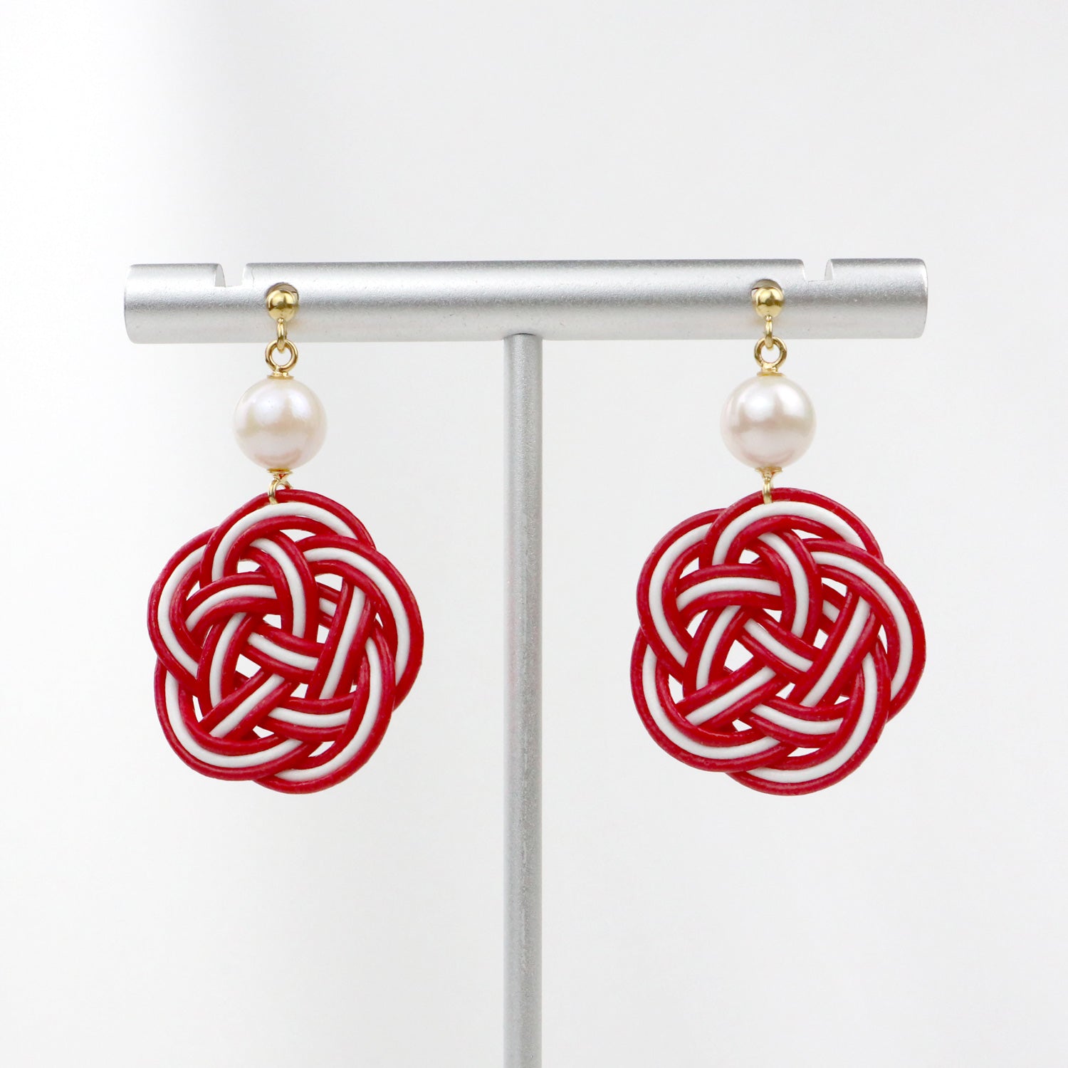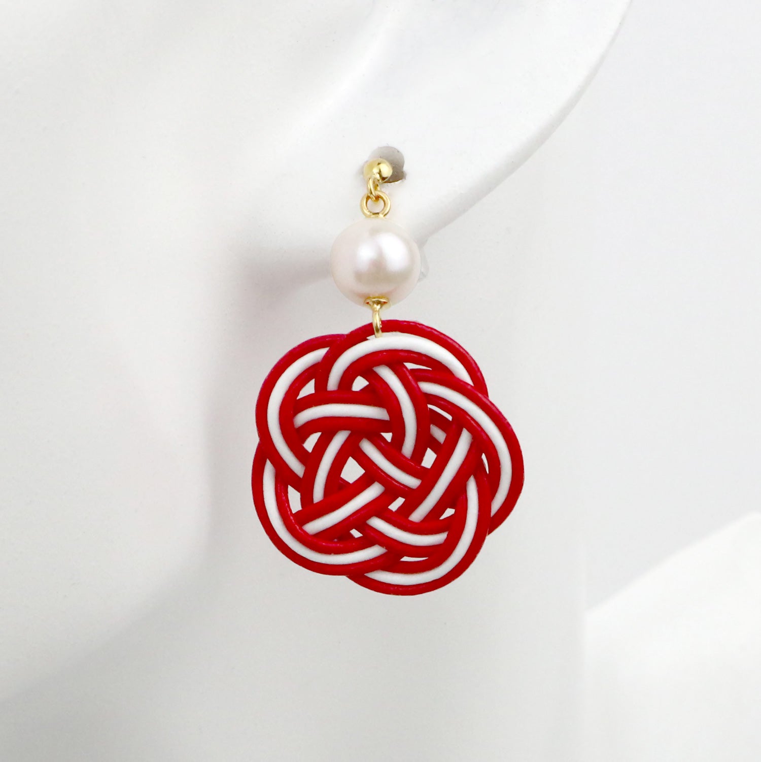 【Ehime Prefecture】Pearl Mizuhiki Earrings Red x White 6.5-7.0mm