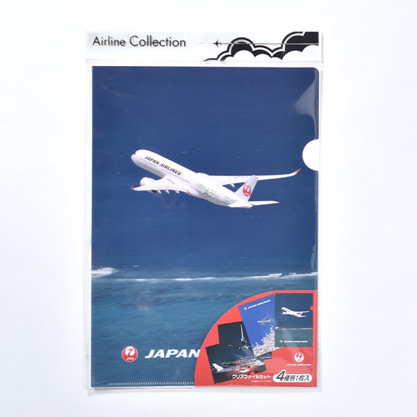 JALロゴと様々なシーンの飛行機写真をセットにした4種各1枚入りのクリアファイル。